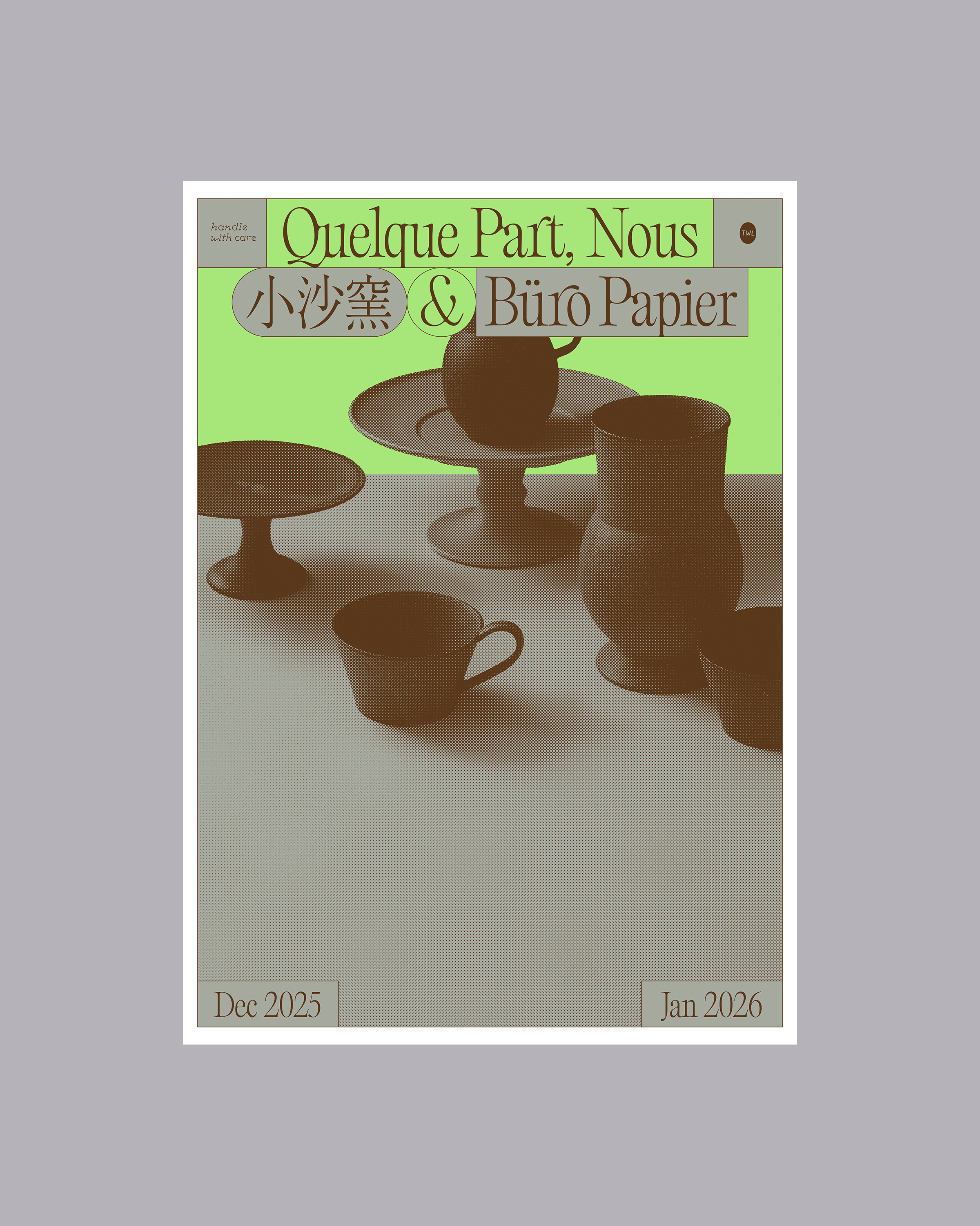 오는 12월 19일, 한 해의 끝과 새해의 시작을 잇는 전시로 소사요와 뷰로 파피에의 작품전 《어딘가, 우리가》를 엽니다. 지난여름 나누었던 짙고 검은 빛깔의 조각을 지나, 소사요 김진완 작가와 뷰로 파피에 사이에는 새로운 일 년의 시간이 쌓였습니다. 그리고 그 시간 속에서 오간 다정한 대화들이 모여 보다 담백한 정물의 형태가 우리를 맞이합니다. 한 번도 만나지 않았지만, 역설적으로 오래도록 바라왔던 순간이 있습니다. 마주하고 나서야 이 만남이 필연이었음을 깨닫는 순간. 소사요와 뷰로 파피에의 첫 만남이 그러했듯, 그런 순간은 특별한 서사를 필요로 하지 않은 채 우리 곁에 담담하게 다가옵니다. 잔과 물동이, 꽃병, 사발과 둥근 접시. 이번 전시에 놓인 작업 또한 그러한 만남의 방식과 닮아 있습니다. 손잡이와 어깨선에 남은 부드러운 곡선이 자연히 시선을 이끌듯이, 소사요와 뷰로 파피에가 나눈 작업은 우리의 일상 정물을 이루는 가장 순하고 편안한 형태로 모습을 드러냅니다. 가장 평범한 형태와 흙의 질감 속에서, 우리가 미처 의식하지 못했던 익숙한 필연을 알아차리는 시간이 되길 바랍니다. with- 전시기획: 핸들위드케어- 포스터 디자인: 이재민 ◆ 2025년 12월 19일 - 2026년 1월 4일◆ 서울시 용산구 녹사평대로 40나길 34, 4층 ◆ Tue - Sun, 12 - 7 PM (Monday Closed) ◆ 070-4900-0104