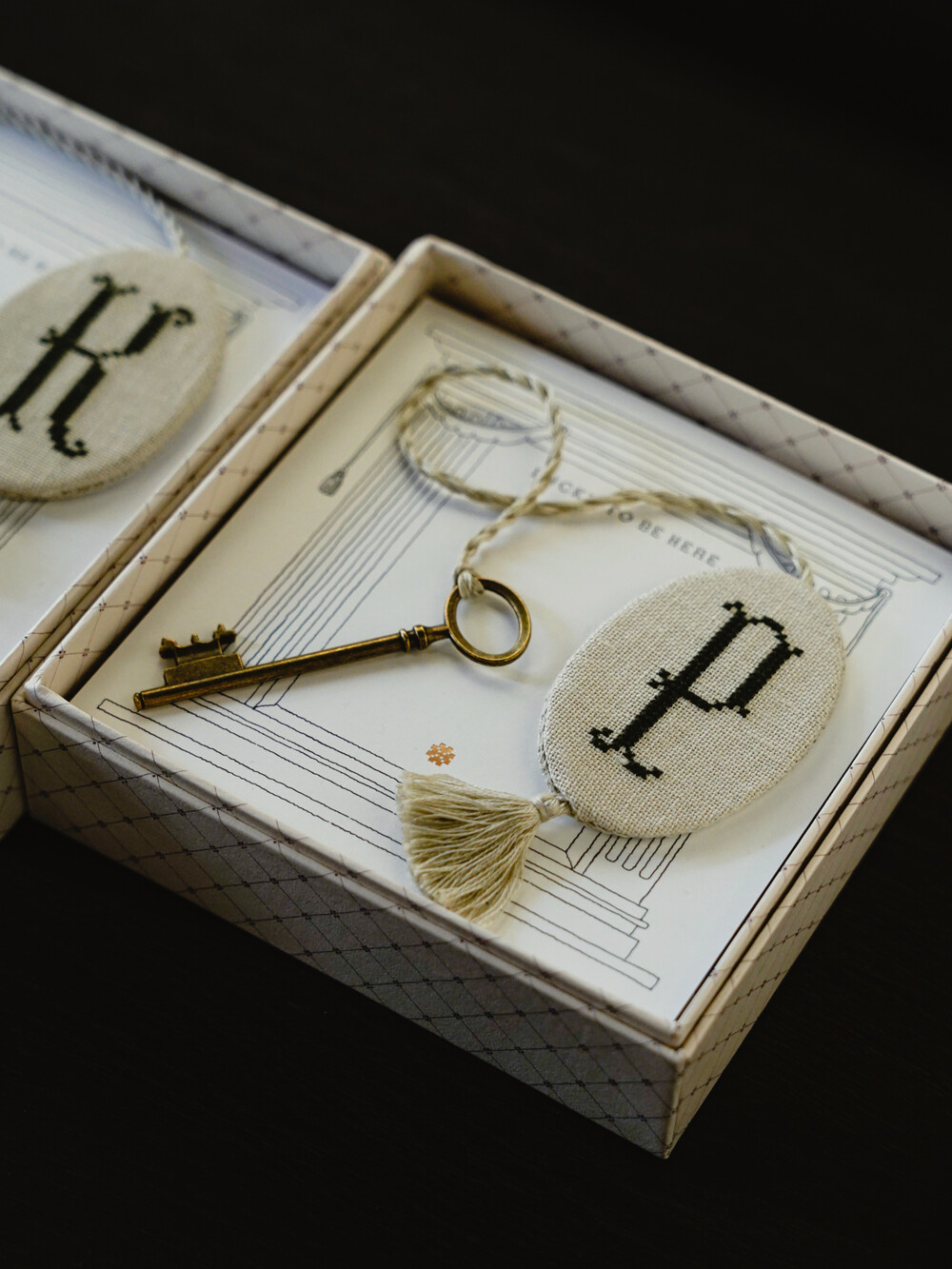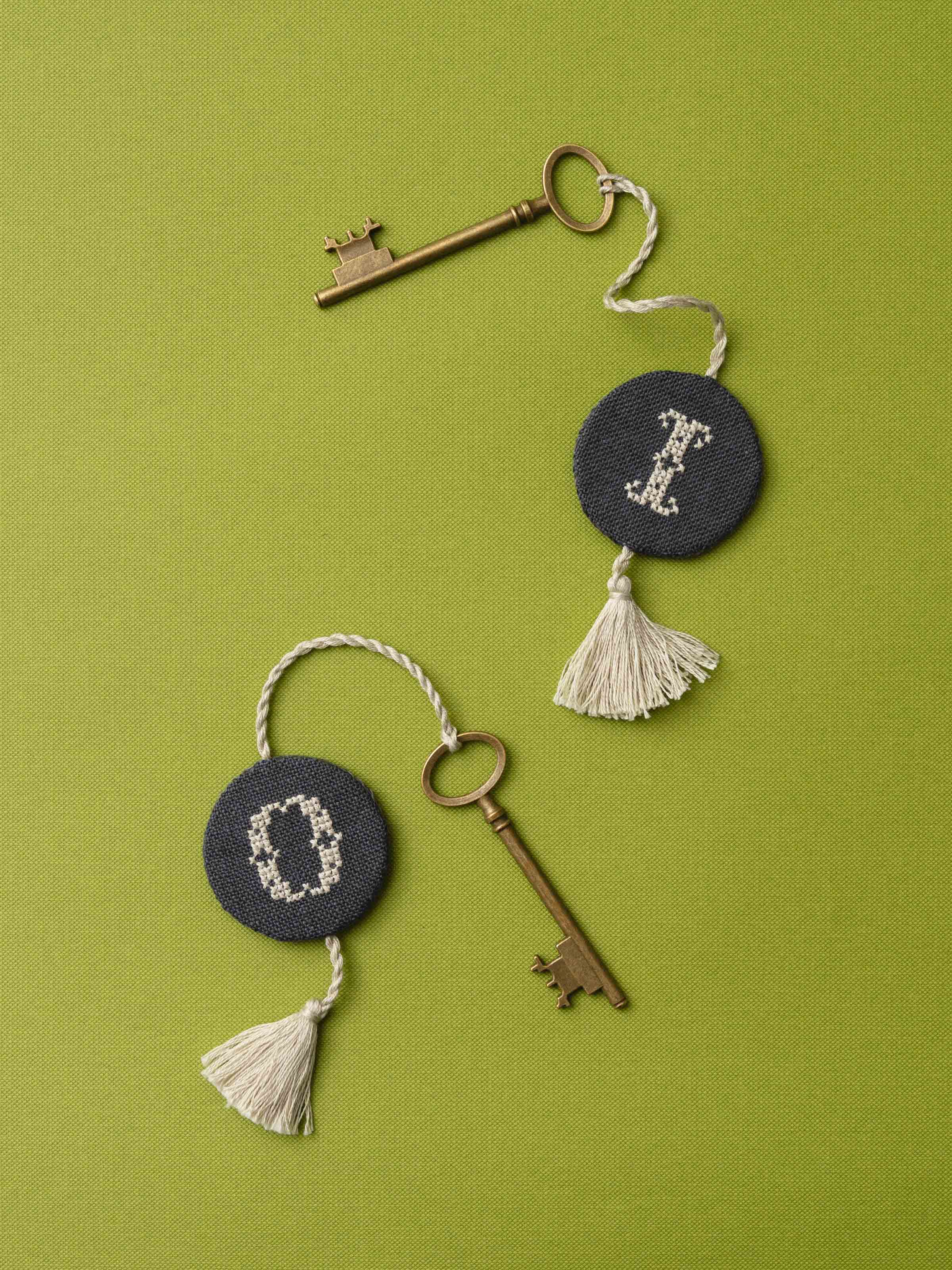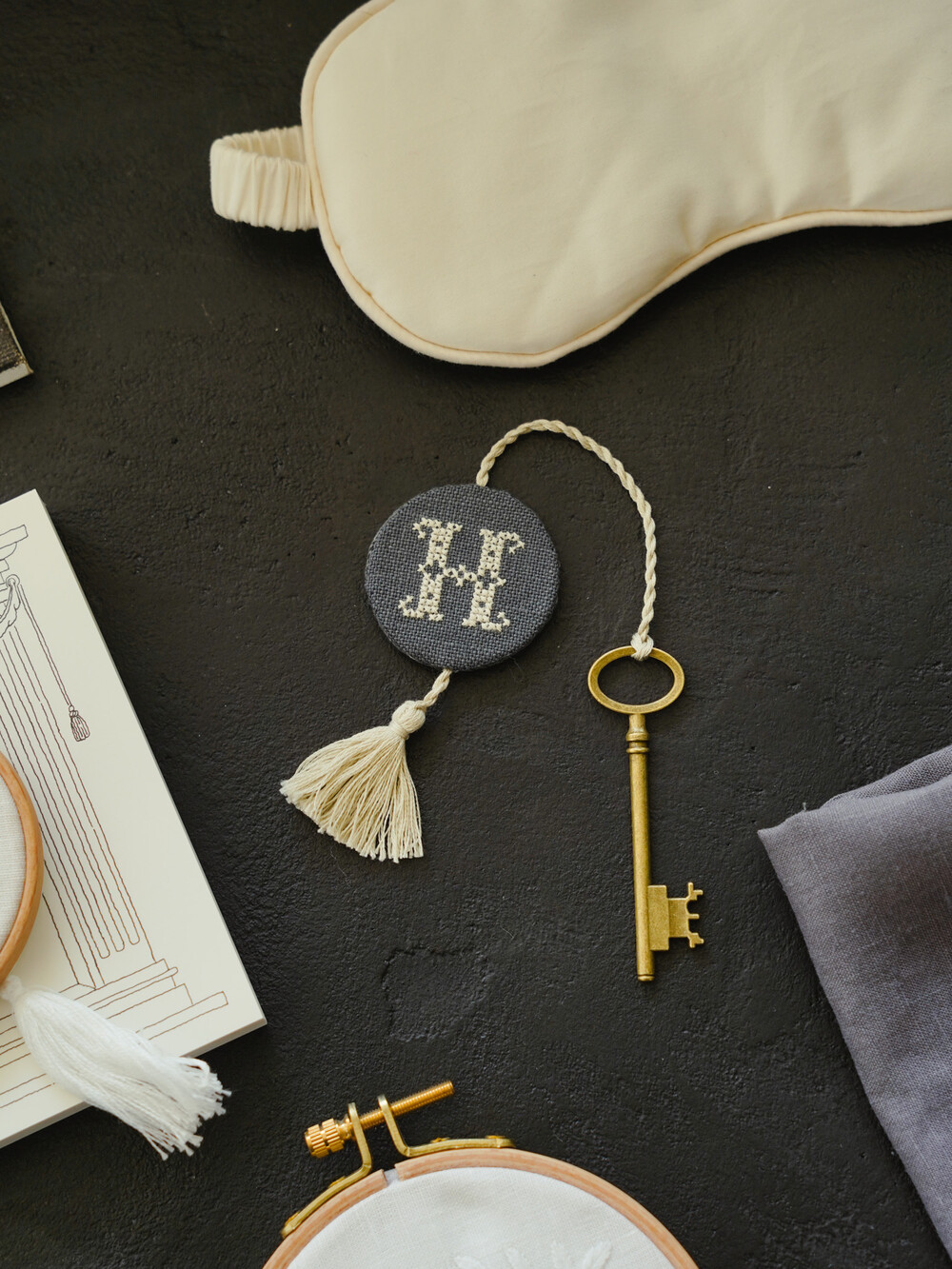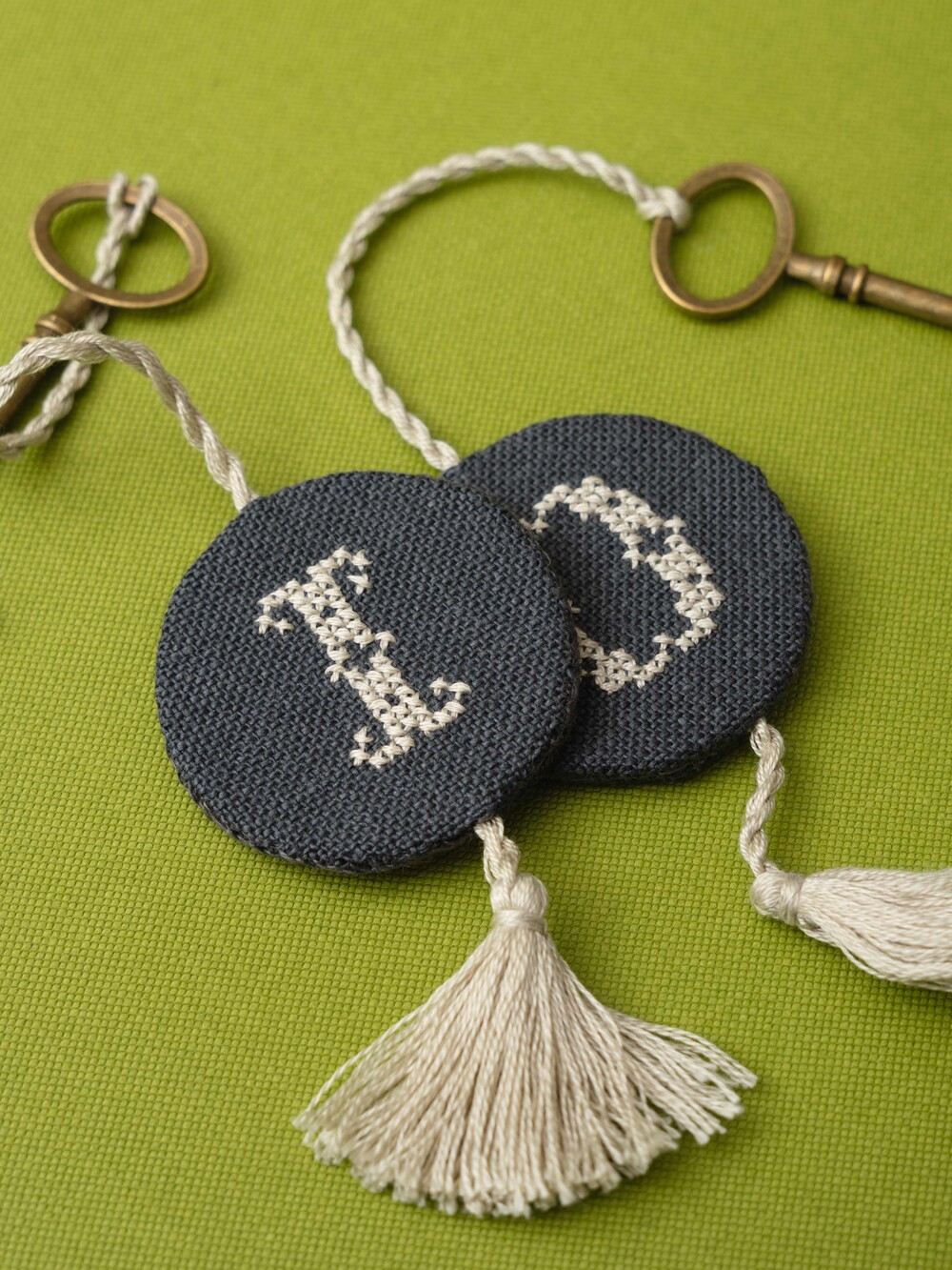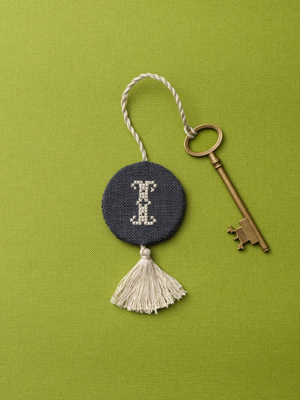카운트가 가능한 독일의 쯔바이 린넨을 사용해 만든 〈KEY - Circle〉 키링입니다. 작가가 호텔을 연다는 마음으로 객실에 놓일 작은 물건을 하나씩 떠올리며 만든 작업입니다. 크로스 스티치 기법으로 칸을 세어 수를 놓고, 끈과 테슬을 손으로 만들어 완성했습니다.